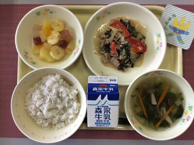 麦ごはん,牛乳,プルコギ,チンゲン菜のスープ,カクテルゼリー和え