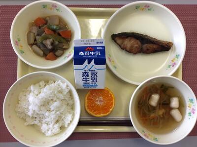 ごはん,牛乳,ぶりの西京焼き,筑前煮,はんぺん雑煮,花みかん