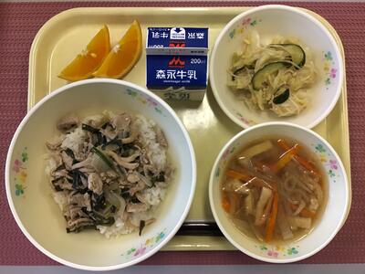 スタミナ丼,牛乳,レモン酢和え,ひきな汁,オレンジ