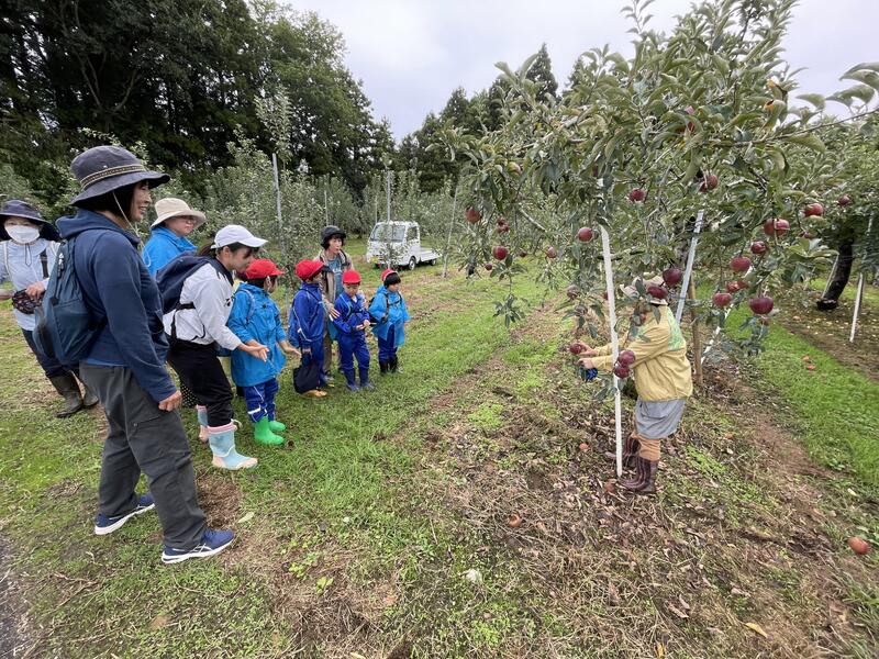 りんご園の山田さんにりんごの扱い方を教わり、いよいよりんごをもぎとります。慎重に両手でそっととる子もいれば、慣れた手つきでとる子もいました。りんごがとれた瞬間には歓声、そして笑顔が見られました。