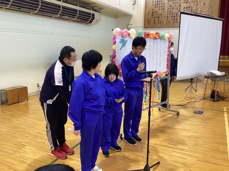 2月22日に卒業生を送る会を行いました。卒業する3年生に楽しんでもらうために、1、2年生が中心となって会の準備、運営を行いました。卒業生の3年間をまとめたスライドショーを見たり、レクリエーション大会をしたりして、参加した全員で楽しい時間を過ごすことができました。