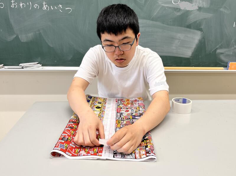 <ゴミ袋作り>チラシをテープで貼り合わせて手順どおりに作っています