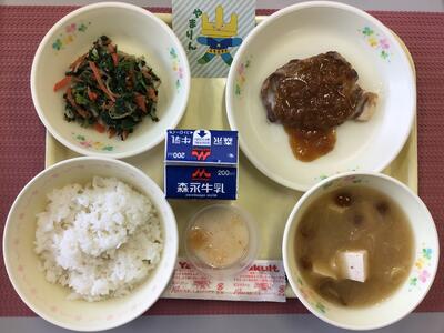 ごはん、牛乳、豚肉の生姜焼き、ちぢみほうれん草のごま和え、なめこ汁、ミルクゼリーいちじくソースがけ