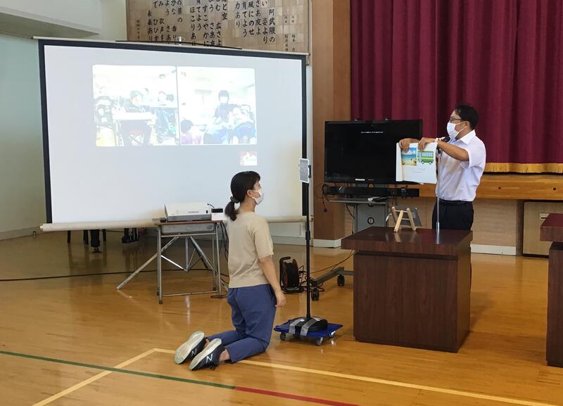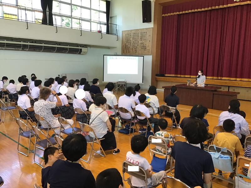 ひまわり教室の全校集会を8月24日に、あすなろ教室の全校集会を25日に本校体育館で行いました。まず夏休み中やこれからの過ごし方についての話があり、次に校歌を斉唱しました。児童生徒は友達や先生と久しぶりに対面し笑顔が見られる場面もありました。