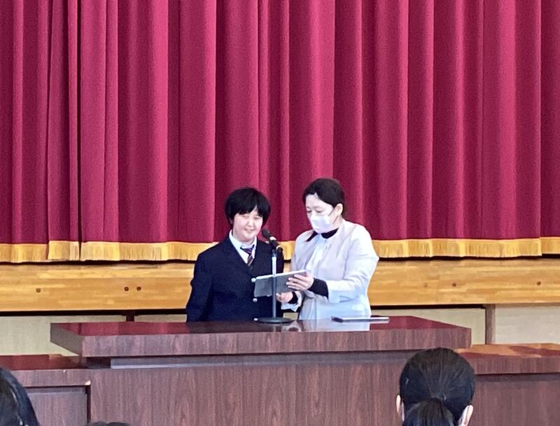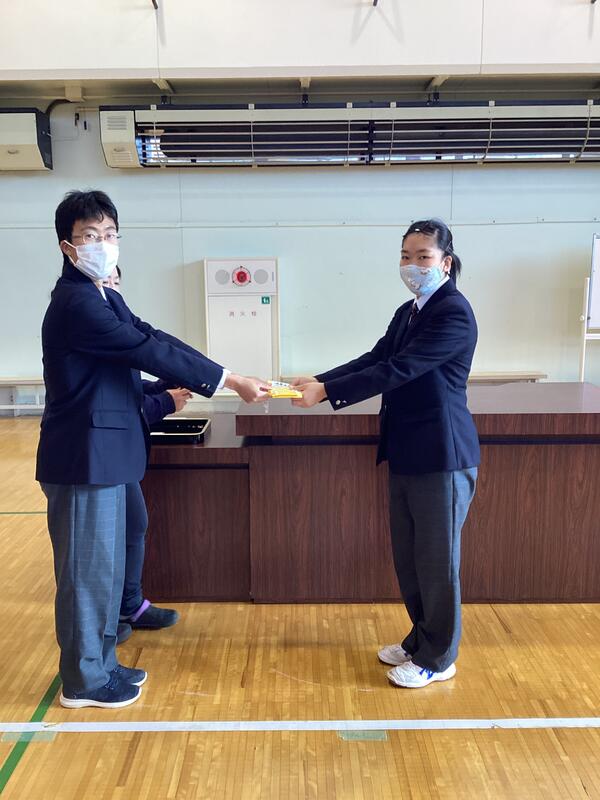 12月1日に生徒会新役員任命式・引き継ぎ式を行いました。最初に新生徒会役員へ任命証授与があり、次に新生徒会長の挨拶、旧生徒会長の挨拶、最後に旧生徒会長から新生徒会長への引き継ぎを行いました。