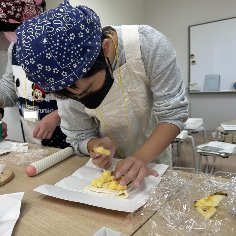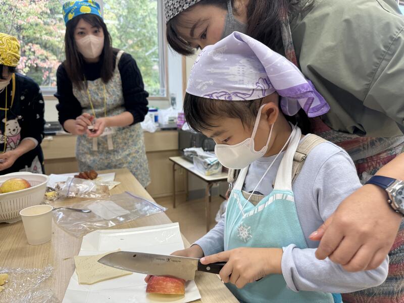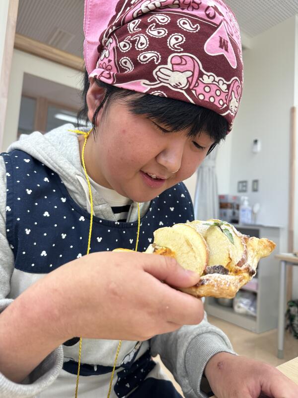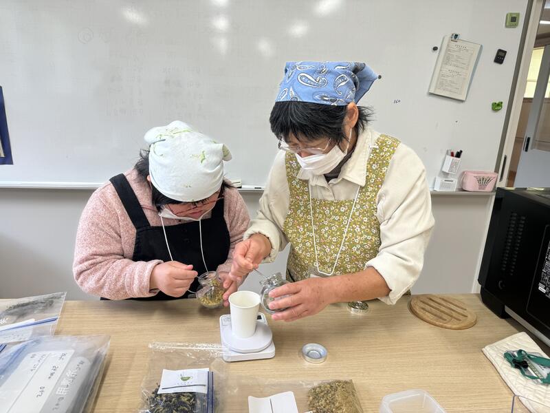 最後は山元町の地場産品であるりんごを使った「簡単りんごパイ」と、本校高等部農業班で育てたハーブとりんご等を乾燥したものを自分好みに調合して「オリジナルフルーツハーブティ」を作りました。