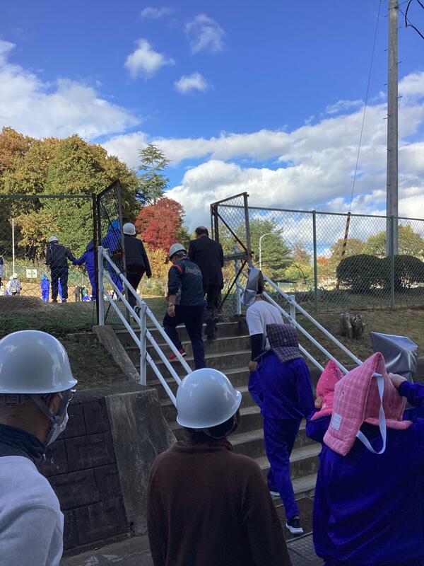 防災頭巾やヘルメットを着用し校庭に一次避難します。