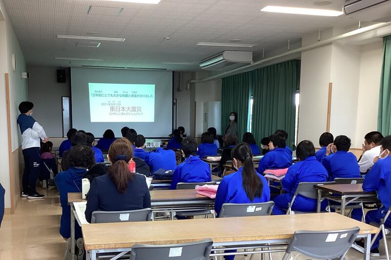 11月24日に避難訓練を行いました。震度6の地震が発生し、間もなく大津波警報を受けたという想定で、児童・生徒は校庭に一次避難しました。その後、校舎4階に二次避難し、中学部、高等部は合同で「地震と津波」についての話を聞きました。