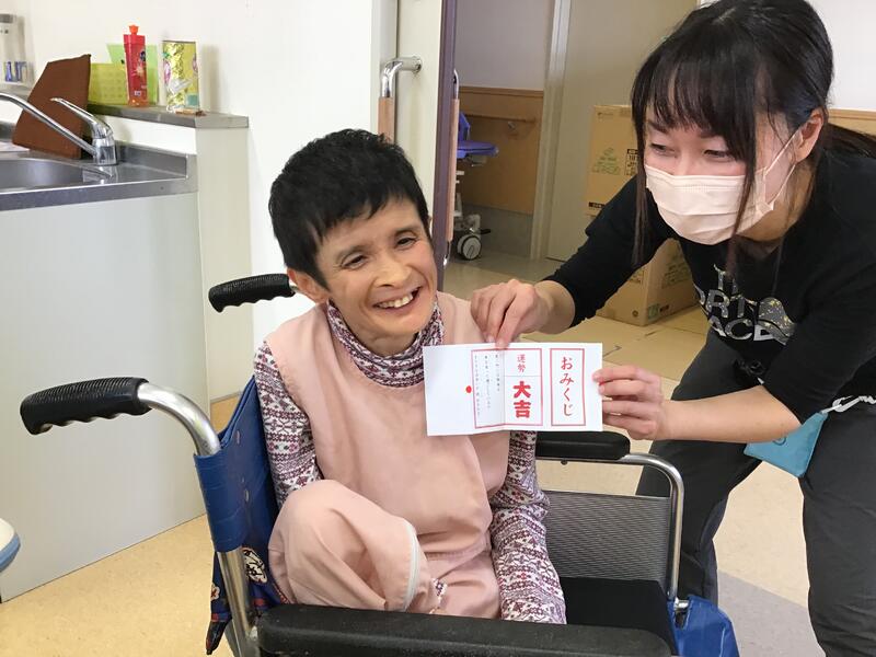 年明けすぐの授業では,1病棟,2病棟それぞれ集まっておみくじを引いたり,獅子舞に頭をかみつかれたり,お正月の行事を体験しました。