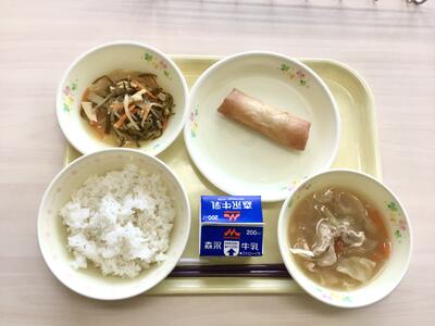 ごはん、牛乳、春巻、細切り昆布のピリ辛炒め、みそ野菜スープ