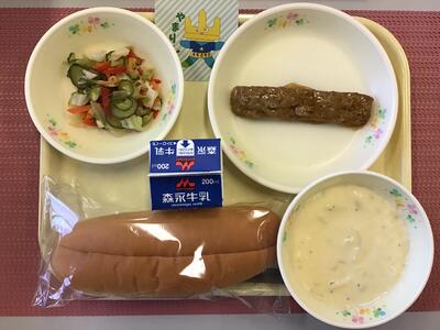 セルフハンバーグドッグ(背割りソフトパン・スティックハンバーグ照り焼きソース)、牛乳、キャベツサラダ、コーンポタージュ