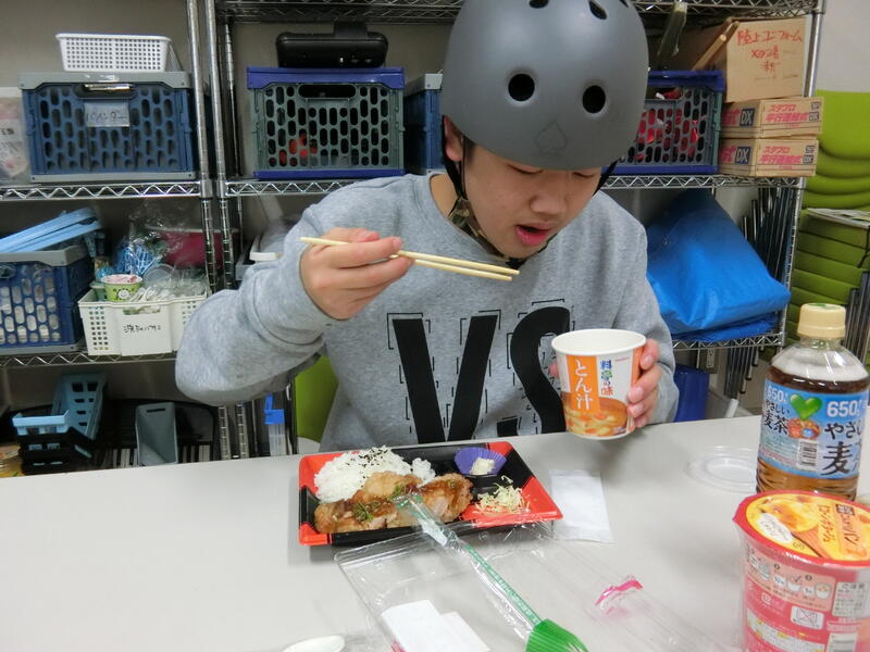 夕食はスーパーで買ったお弁当などを学校でみんなで食べました!