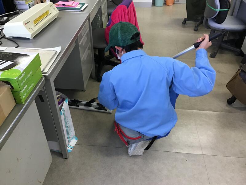 サービス班② モップやダスターの使い方を学び,学校内を清掃しています。