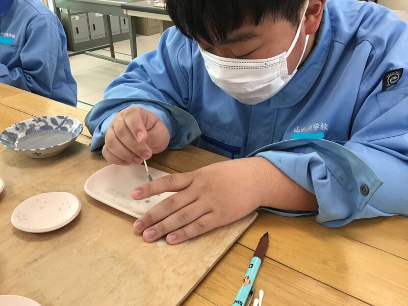 クラフト班① 陶芸ではお皿を作っていて,1枚1枚丁寧にやすりがけや絵付けをしています。