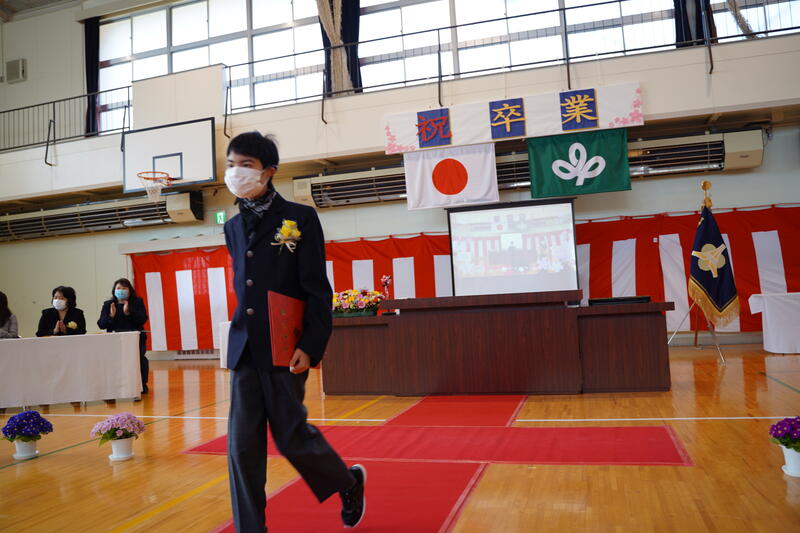 今年度は感染症対策を含め新しいスタイルでの卒業証書授与式となり,在校生は別室でリモート中継をつないで参加しました。“例年通り”ではないものの,事前に録画した在校生からの贈る言葉や卒業生からの卒業の言葉の上映をして,児童生徒の気持ちが伝わり合った温かい式となりました。