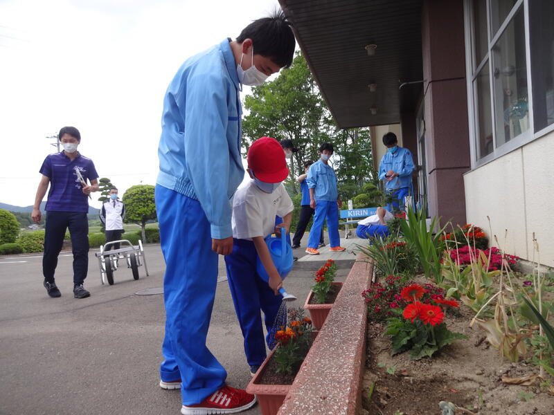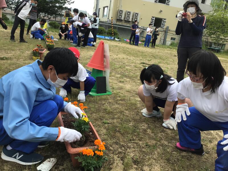 5月25日(火)今年度初めての花いっぱい運動(植栽作業)を行いました。小学部から高等部の児童生徒が縦割りで4つのグループに分かれ,プランターにマリーゴールドを植えました。高等部生徒が小中学部の児童生徒に植え方を教えたり,サポートしたりと,異年齢の交流はどの学部の児童生徒にとっても有意義な時間となりました。プランターは,学校周辺の宮城病院,第二みやま荘,地球村・清和園,桜塚集会所に置かせていただきました。地域の方々にそれぞれの場所の花をみて,温かい気持ちになってもらいたいと思います。今後は児童生徒が交代で水やりなどの管理を行います。
