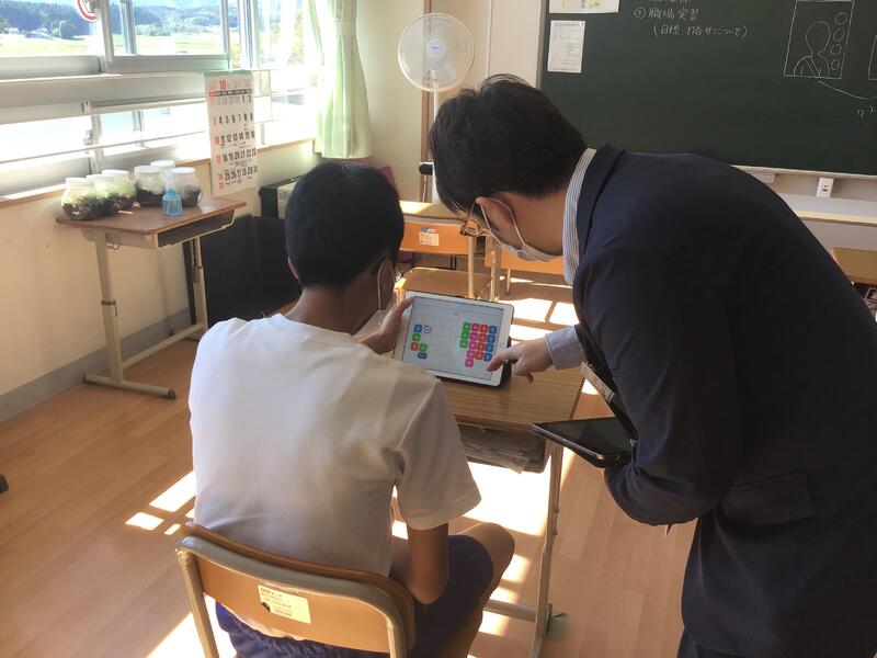 「もし自宅でオンラインで授業をすることになったら」という想定で,学級に所属している5名が校内の別々の教室に1人ずつ分散し,オンラインで会話をしながら朝の会や生活単元学習の授業を行いました。生徒たちは,初めての経験に戸惑いながらもICT支援員の方にも支えられながら,楽しく活動していました。