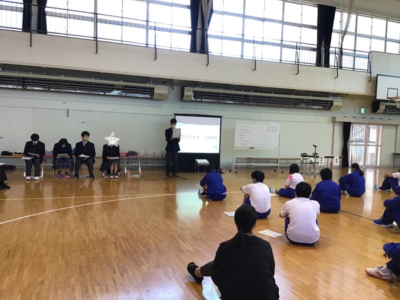 生徒総会では,令和3年度の活動報告や令和4年度の活動計画,生徒会会則案について報告と承認がありました。その後,今年度の生徒会役員の自己紹介があり,スローガンが発表されました。今年のスローガンは「笑顔 いっぱい 山元支援」です☺