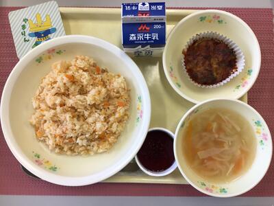 にんじんとツナのピラフ、牛乳、かぼちゃのミートソースグラタン、ジュリエンヌスープ、ブルーベリーゼリー