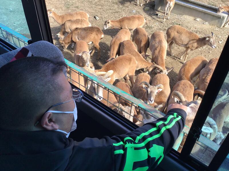 2日目は,南三陸のさんさん商店街で買い物をしたあと,岩手サファリパークに行きました。バスの窓から長い首と舌を伸ばして顔をのぞかせるキリン,目の前に横たわるライオンなど,まさに天空のサバンナ!本物の象に乗る体験もできました。
