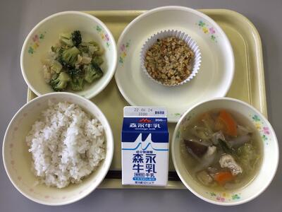 麦ごはん,牛乳,五目納豆,ブロッコリーとキャベツのごま和え,塩ちゃんこ汁