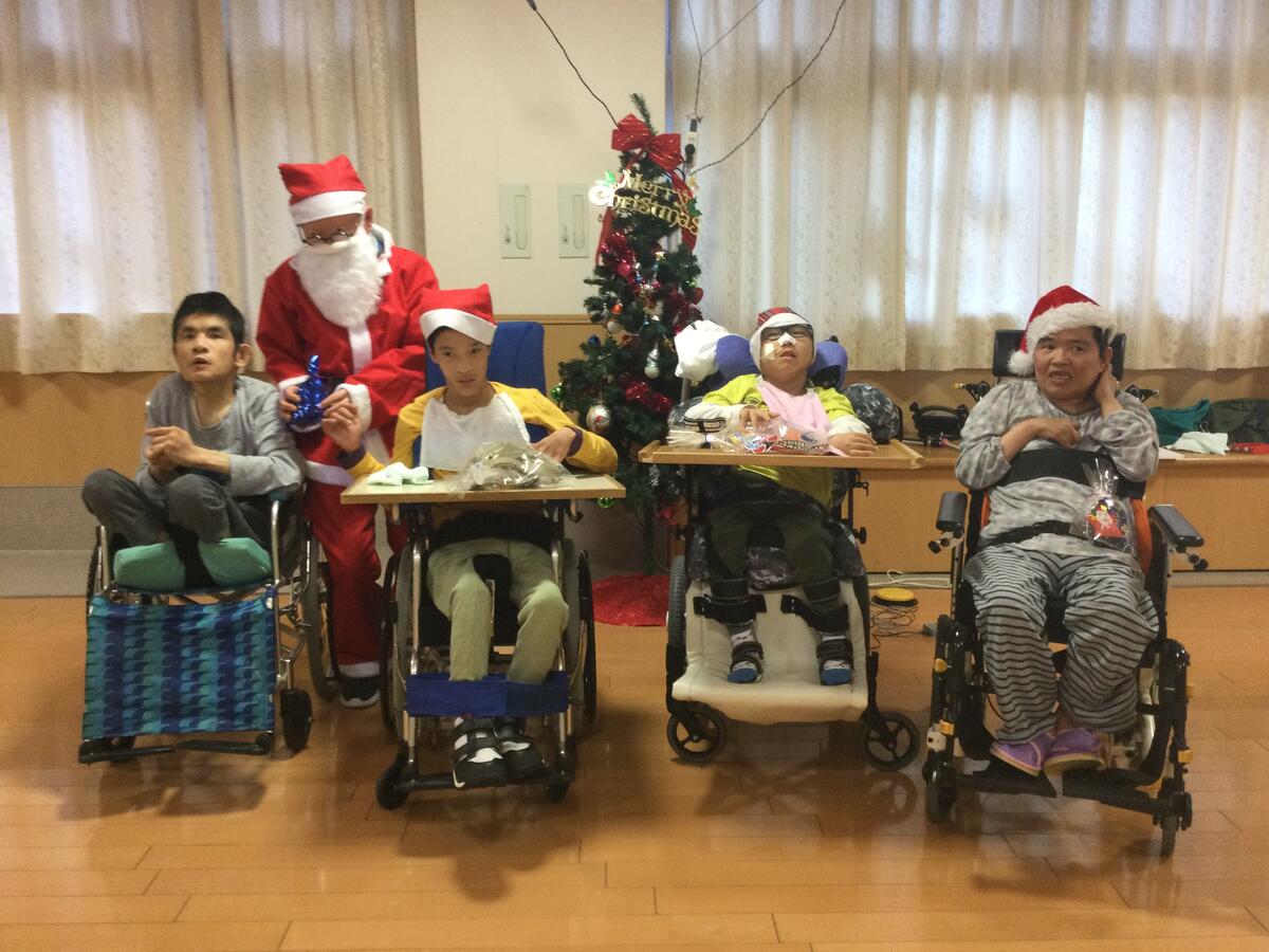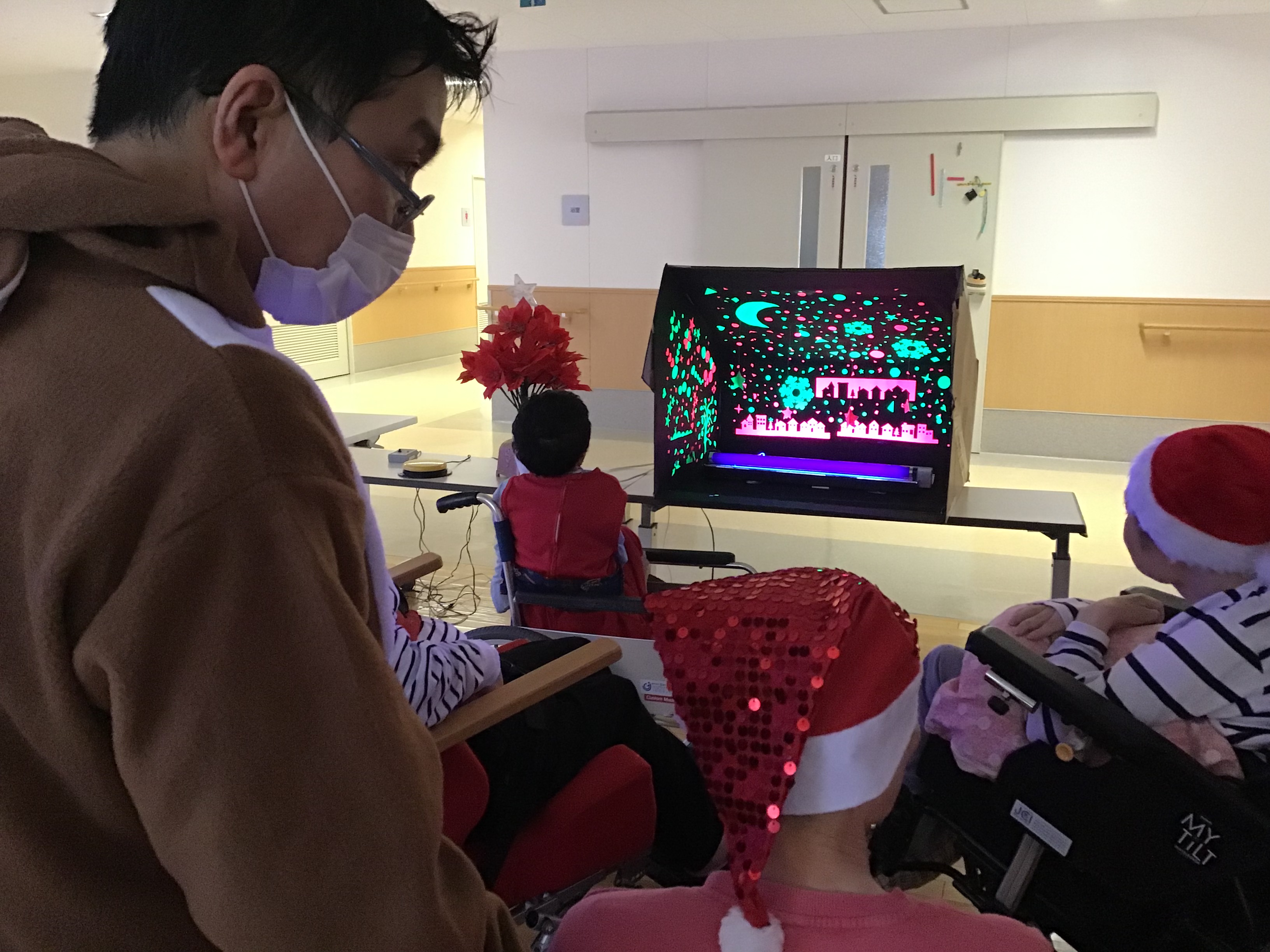 今月は1病棟,2病棟それぞれで全員が集まり,クリスマス会を行うことができました。いつも2人ずつ授業を行っていたので,4人全員で集まって授業ができたのは今年度初めてです。少し暗くしてイルミネーションを見たり,ツリーやリースに飾り付けをしたり,クリスマスの歌を演奏したりと各病棟でいろいろな活動を楽しみました。