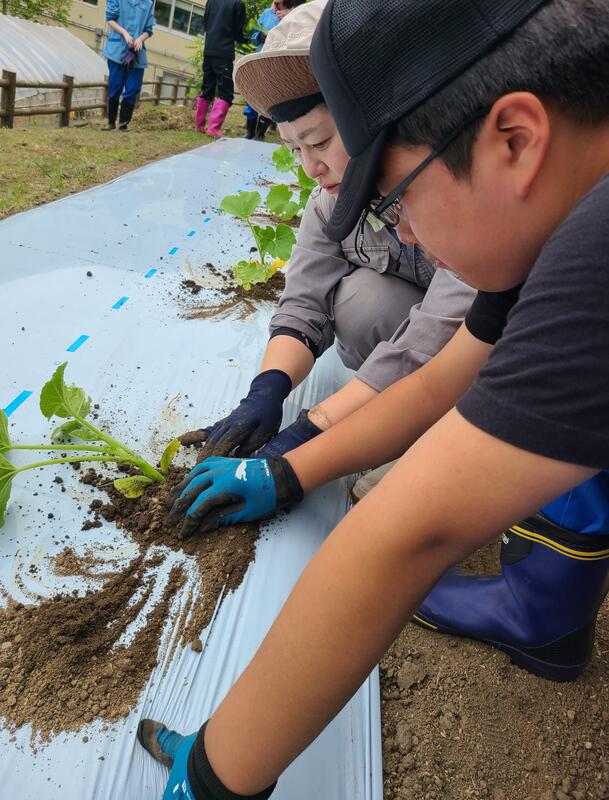 <農業>~かぼちゃの定植~優しく土を寄せます