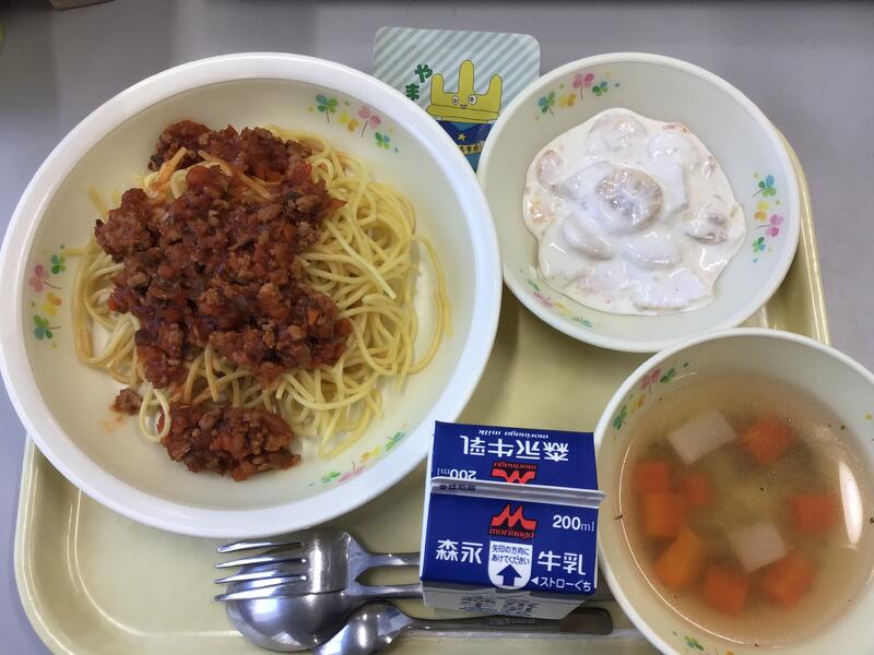 〈献立名〉 スパゲティミートソース 牛乳 フルーツヨーグルト和え コロコロ野菜スープ
