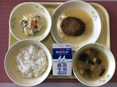 ごはん,牛乳,ハンバーグおろしポン酢ソースがけ,ポテトサラダ,小松菜と油揚げのみそ汁