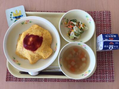 オムライス、牛乳、コールスローサラダ、豆と野菜のスープ