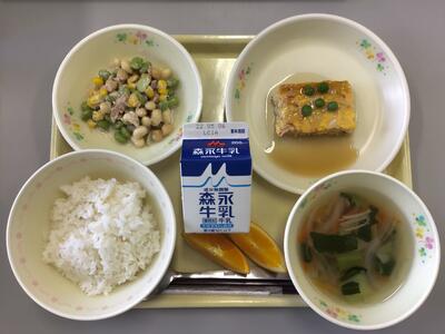 ごはん,牛乳,かに玉風卵焼きの甘酢あんかけ,まめまめサラダ,チンゲン菜のスープ,オレンジ