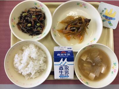 ごはん、牛乳、かつおの野菜あんかけ、ひじきの炒り煮、白菜のみそ汁
