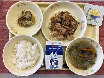 麦ごはん、牛乳、豚肉のねぎみそ焼き、れんこんの塩きんぴら、五目すまし汁