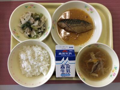 ごはん,牛乳,さばのみそ煮,れんこんの塩きんぴら,沢煮椀