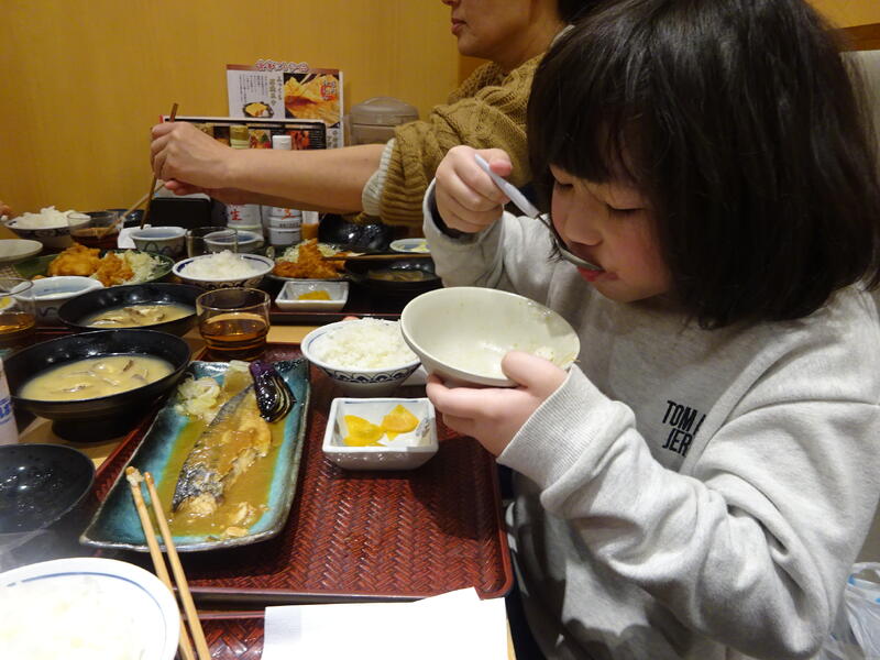 買い物を頑張ったあとはお昼ご飯。サバの味噌煮、おいしいね!