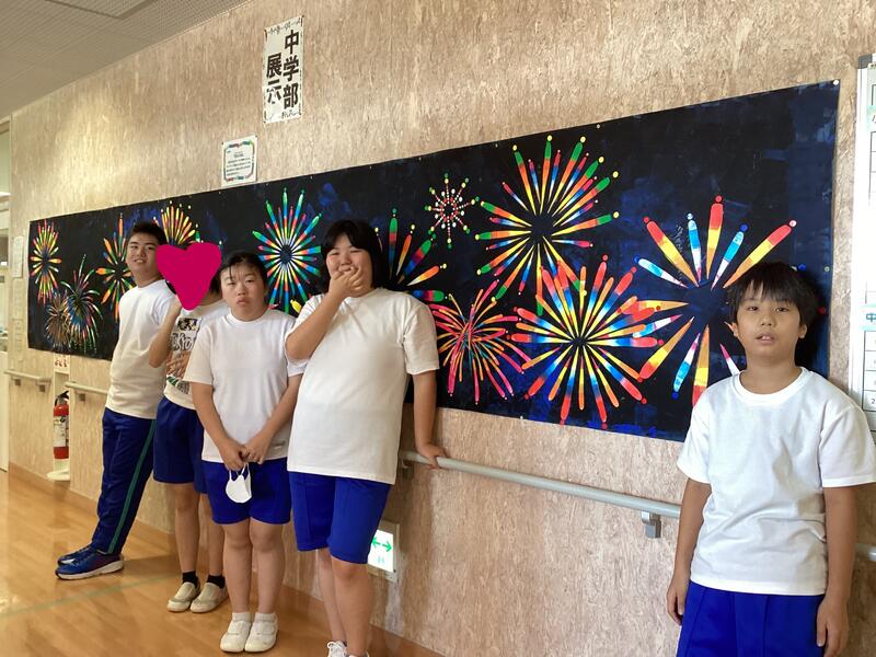 9月30日(土)に学校祭がありました。中学部は、「発表」「展示」「販売」に取り組みました。発表では、ギター・鉄琴・和太鼓を使った3曲を披露しました。展示では、花火大会をテーマに制作し、展示しました。販売では、牛乳パックから作った紙すきカレンダーと、廃材で作ったエコたわしを販売しました。