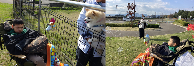 「こんにちは。お名前はなぁに?」 シャボン玉も楽しみました。