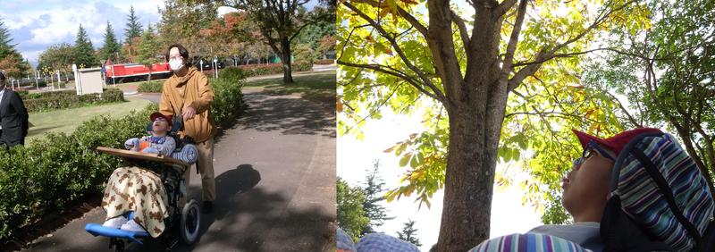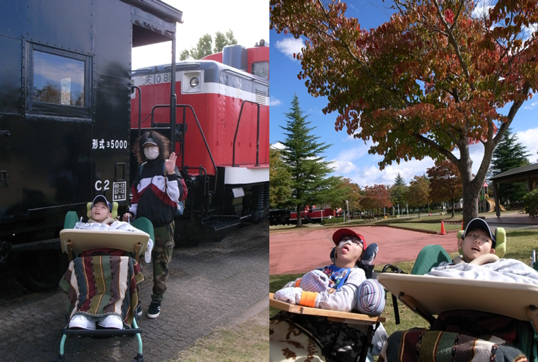 角田中央公園では、秋の空気を感じたり、間近で見る機関車の大きさに驚いたり、病棟では味わえない屋外ならではの体験をしてきました。