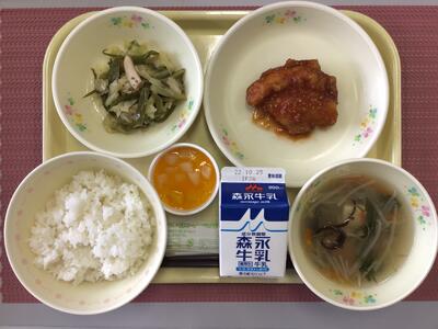 ごはん,牛乳,ヤンニョムチキン,キャベツの塩昆布炒め,もやしのスープ,フルーツ杏仁風プリン