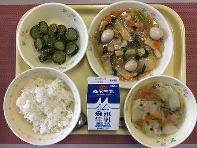 ごはん,牛乳,八宝菜,ごまきゅうり漬け,ワンタンスープ
