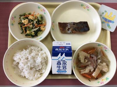 麦ごはん、牛乳、さわらのみそ焼き、野菜と卵の和え物、手作りはっと汁