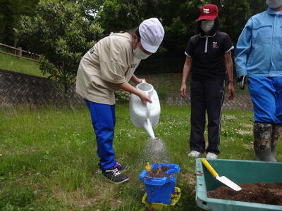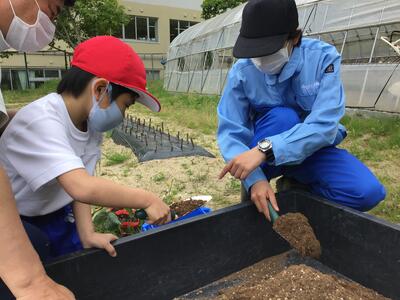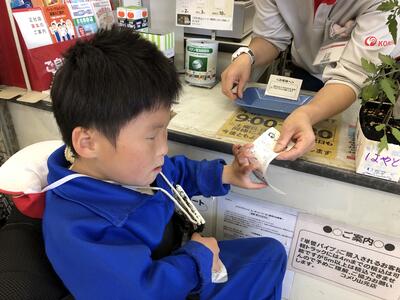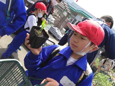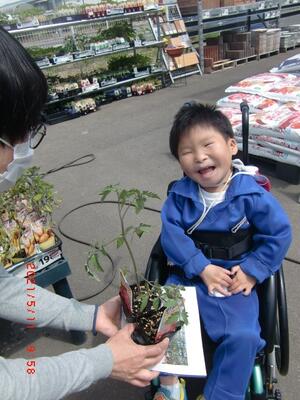 5月11日に校外学習に行ってきました。コメリ山元店へ行き,それぞれが事前学習で決めた野菜の苗を探して買いました。一人ずつレジで会計を行うことができました。その後,つばめの杜中央公園へ移動して遊びました。天気に恵まれ,たくさんの遊具で時間いっぱい走り回っていました。買ってきた野菜の苗は,5月13日に高等部農業班のお兄さん,お姉さんたちに植え方を教えてもらって,自分たちで植えました。水やりを継続的に行い,育つのを観察していく予定です。