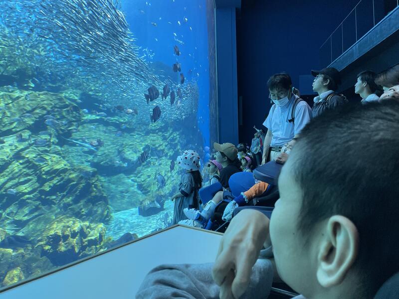 あすなろ教室の中学部と高等部の3年生は修学旅行で仙台うみの杜水族館へ行ってきました。キラキラと輝きながら泳ぐ魚や大きなカニなどを見て回りました。