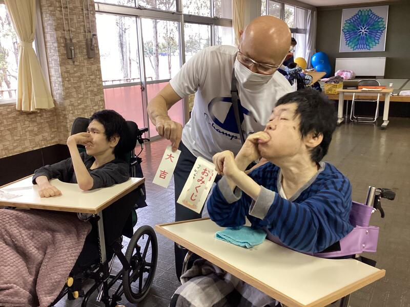 新年を迎え、あすなろ教室では学習のテーマが「お正月」なので、初詣や書き初め、たこあげ、羽根つき、福笑いなど伝統的な日本の習慣を学びました。