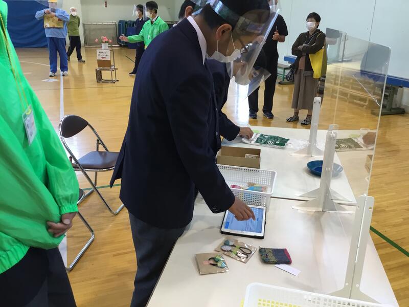【高等部の販売】クラフト班。さをり織りで製作した布を加工してエコバッグにしました。