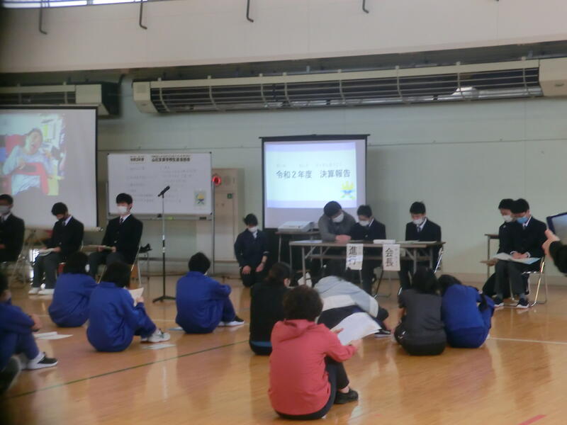4月30日(金)本校体育館にて令和3年度の生徒会総会を行いました。生徒会役員にとって今年度初めての大きな行事だったこともあり,皆緊張した面持ちでしたが,事前に練習を重ねたおかげでスムーズに会を進行することができました。あすなろ教室の生徒会役員は,病棟からリモート中継で参加しました。