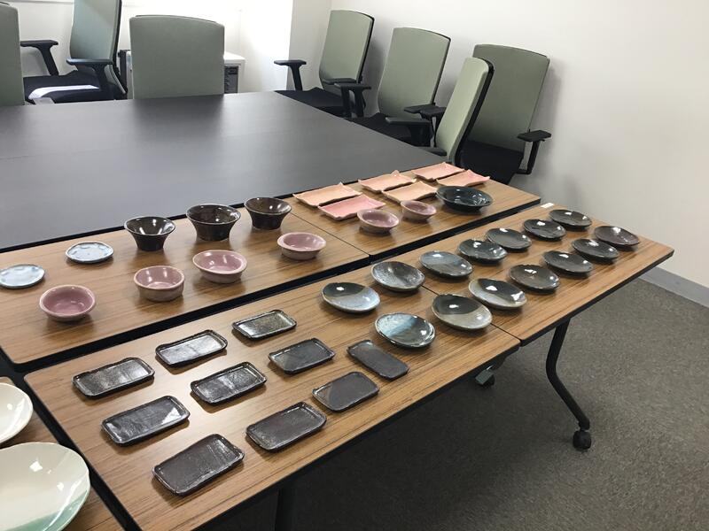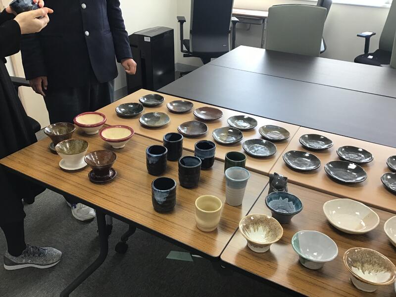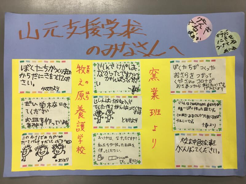 牧之原養護学校陶芸製品については,年度末に児童生徒の皆さんが一つずつ持ち帰り,各家庭で使用させていただいています。木山中学校からのメッセージにつきましては,昇降口右手に掲示しております。