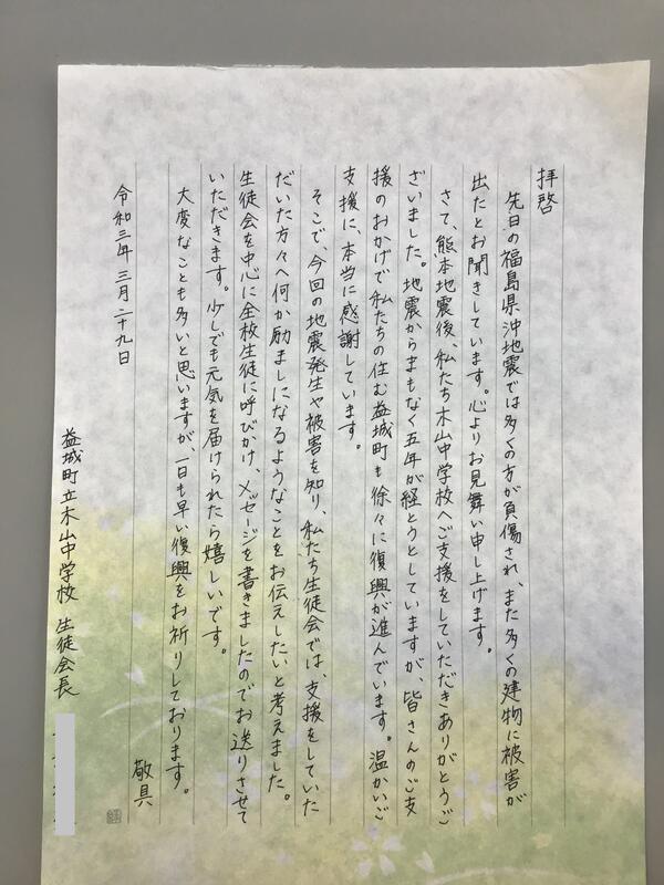 2月の福島県沖地震の被害を心配して,鹿児島県立牧之原養護学校から作業学習で作った陶芸製品,熊本県益城町立木山中学校よりお見舞いのメッセージをいただきました。