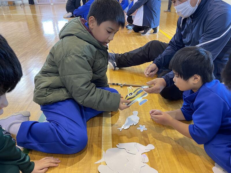 2月7日(水)に第3回やまりん集会を行いました。小学部から高等部までが縦割で4つのグループに分かれ、魚釣りゲームを行いました。まず、グループごとに順番決めと作戦会議を行いました。ゲームがスタートすると、うまく魚が釣れない小学部の児童に対して、手を引いたり一緒に釣りを手伝う中学部・高等部の姿が見られました。