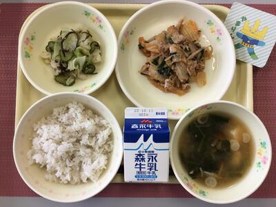 麦ごはん、牛乳、豚キムチ炒め、キャベツときゅうりの塩昆布和え、なめこ汁
